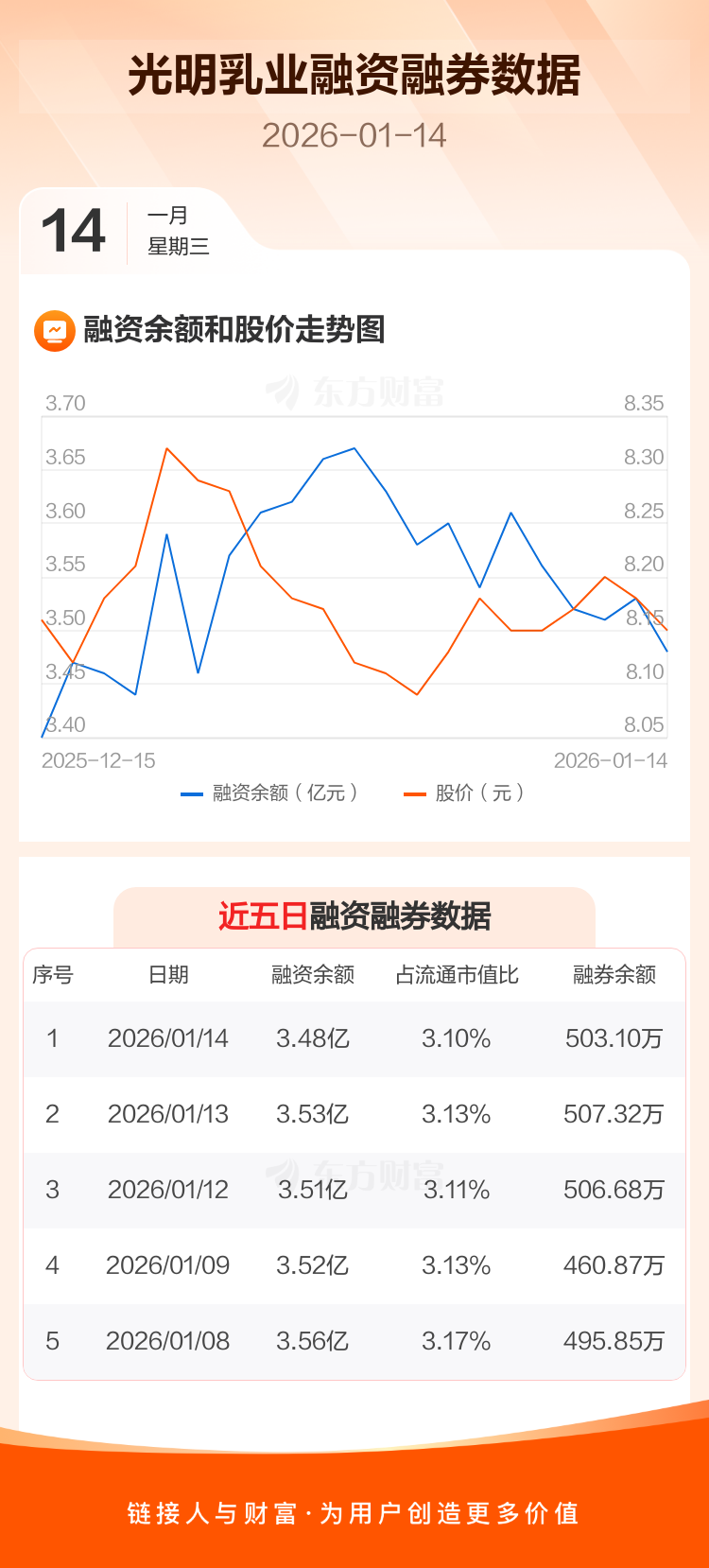 交易所最新数据显示,光明乳业于2026年1月14日获融资买入1440.24万元,融资偿还1923.62万元,当日融资净偿还483.38万元。目前,该股融资余额3.48亿,占流通市值比例为3.10%。