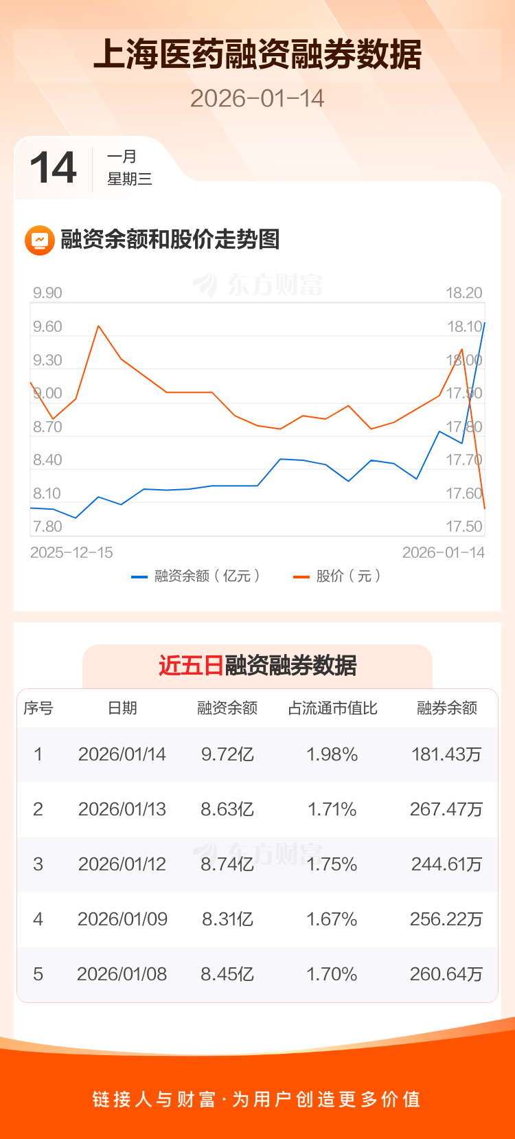 交易所最新数据显示,上海医药于2026年1月14日获融资买入1.93亿元,融资偿还8356.40万元,当日融资净买入1.09亿元。目前,该股融资余额9.72亿,占流通市值比例为1.98%。