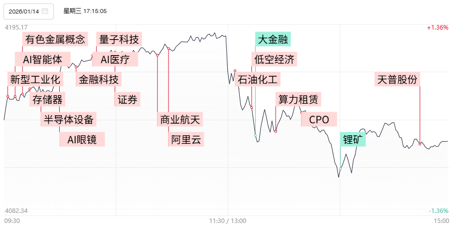 财联社1月15日电,上个交易日市场冲高回落,沪指午后快速翻绿,此前一度涨超1%。全市场超2700只个股上涨。沪深两市成交额3.94万亿,较前日放量2904亿,连续第3个交易日突破3.5万亿。1)《科创板日报》记者从多方独家获悉,上线两个月,千问C端月活跃用户数(MAU)已突破1亿,AI应用端短暂分歧后迅速得到回流,AI电商、GEO概念以及部分阿里概念股涨势火热,省广集团、利欧股份等实现连板晋级,20厘米人气股光云科技、值得买、壹网壹创等反包涨停,美登科技、凯淳股份等补涨品种层出不穷涌现。2)科技大厂在大模型方面竞争使得算力基础设施建设也维持高增长,刺激算力租赁概念再度活跃,宏景科技午后封20厘米涨停,大位科技、实达集团、华胜天成反包涨停,润泽科技、艾可蓝等涨超10%。3)近期全球多地八英寸晶圆代工厂酝酿涨价。受益全球存储以及先进制程的扩产逻辑,半导体设备股结束调整卷土重来,洁净室龙头亚翔集成、圣晖集成双双涨停,耐科装备、长川科技、金海通创出历史新高。4)1月13日23时25分,由火箭院研制的长征八号甲运载火箭成功将卫星互联网低轨18组卫星送入预定轨道,发射任务取得圆满成功。商业航天概念内部两极分化态势依旧,高位股中国卫通、顺灏股份、雷科防务等遭遇二连跌停,但银河电子、海格通信、三维通信、金隅股份等近端抱团品种仍实现连板晋级。
