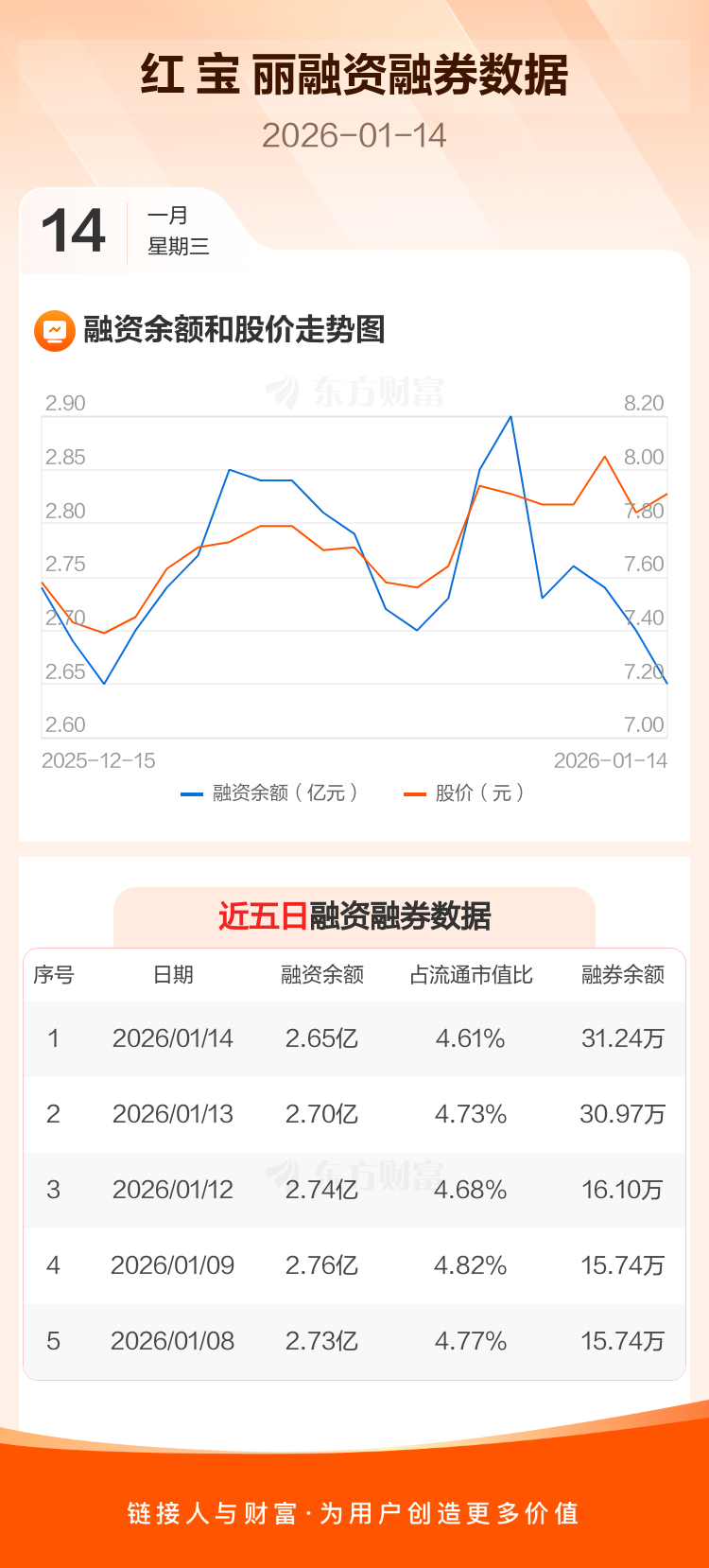 交易所最新数据显示,红 宝 丽于2026年1月14日获融资买入2386.17万元,融资偿还2862.20万元,当日融资净偿还476.02万元。目前,该股融资余额2.65亿,占流通市值比例为4.61%。