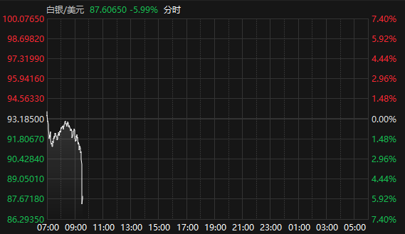 上证报中国证券网讯据Choice数据,1月15日,国际现货白银短线跳水,截至9:33报87.60美元/盎司,跌近6%。