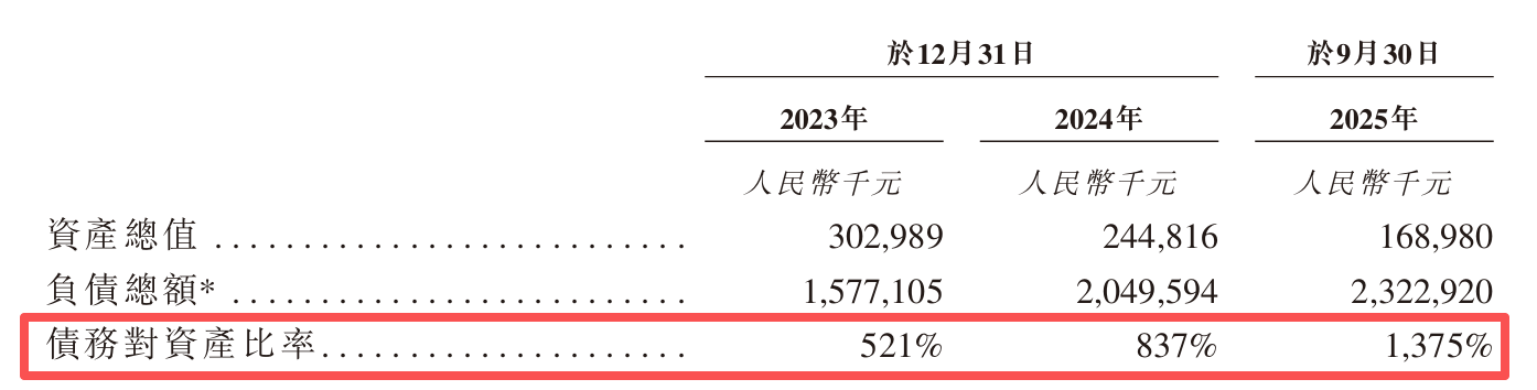 在连续多年亏损的背景下,亦诺微医药在报告期内的负债净额持续攀升,分别为12.74亿元、18.05亿元和21.54亿元,资产负债率分别为521%、837%、1375%。截至2025年9月末,亦诺微医药现金及现金等价物仅剩6859.4万元。