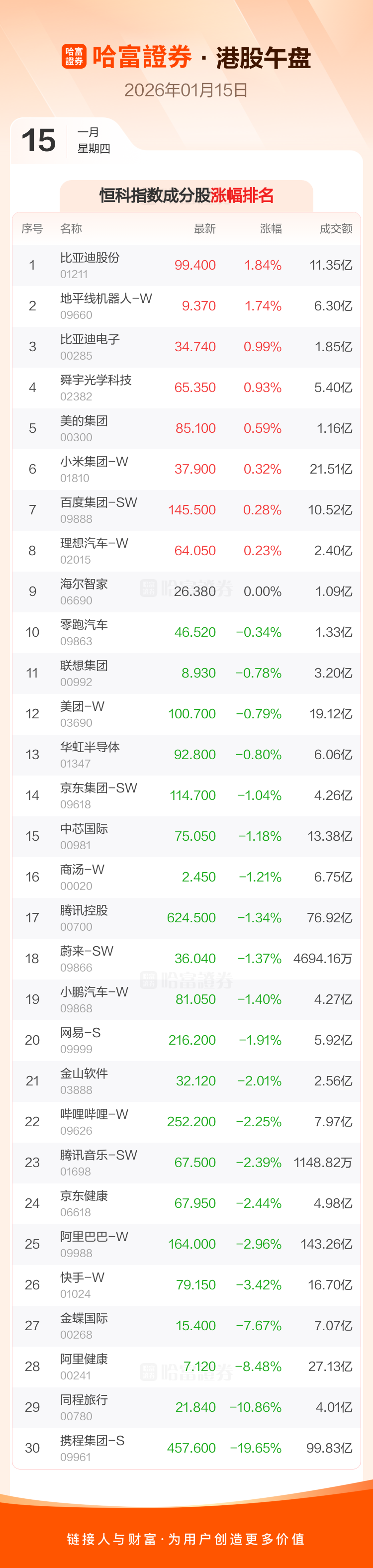 港股1月15日午盘走低 ,恒生指数收报26852.31点,跌147.5点,跌幅0.55%;恒生科技指数收报5800.32点,跌107.94点,跌幅1.83%。恒生指数成分股中中国海洋石油、新鸿基地产、申洲国际涨幅居前,携程集团-S、阿里健康、快手-W跌幅靠前。恒生科技指数成分股中比亚迪股份、地平线机器人-W、比亚迪电子涨幅居前,携程集团-S、同程旅行、阿里健康跌幅靠前。