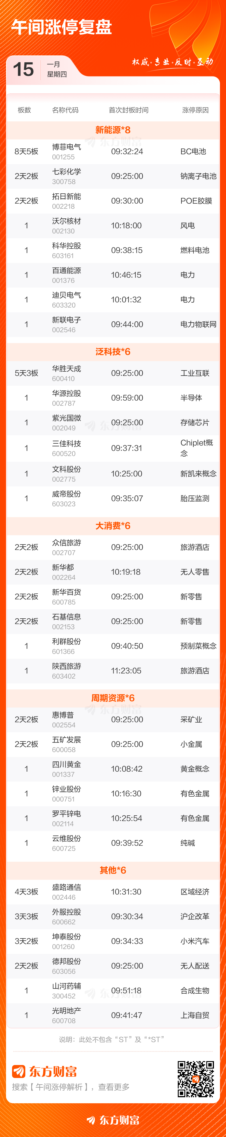 1月15日午间涨停复盘:38股涨停 博菲电气8天5板