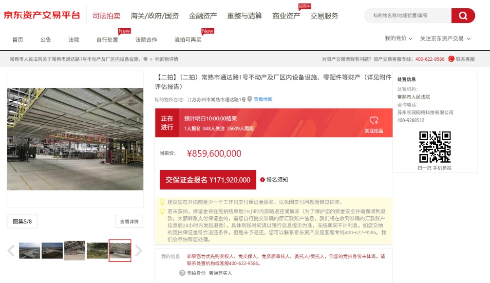 1月15日上午10点,京东资产交易平台披露的信息显示,常熟市通达路1号不动产及厂区内设备设施、零配件等财产二次拍卖启动。