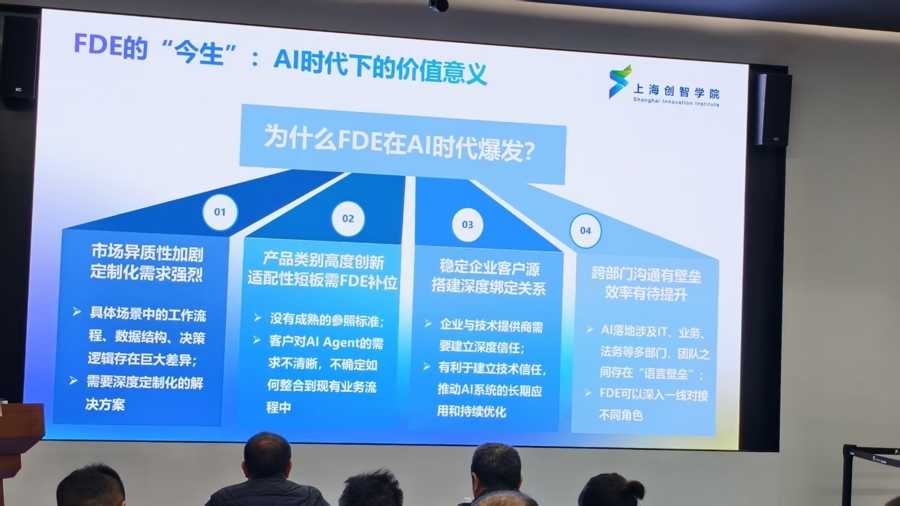 上海创智学院党委书记、常务副院长丁晓东说,FDE模式早已出现,但在AI时代全面爆发,因为它给应用场景带来实实在在的价值。AI的商业化落地需要“跨界翻译官”,他们要能够主动将抽象的算法模型转化为工程师可操作、产业可验证的具体方案。