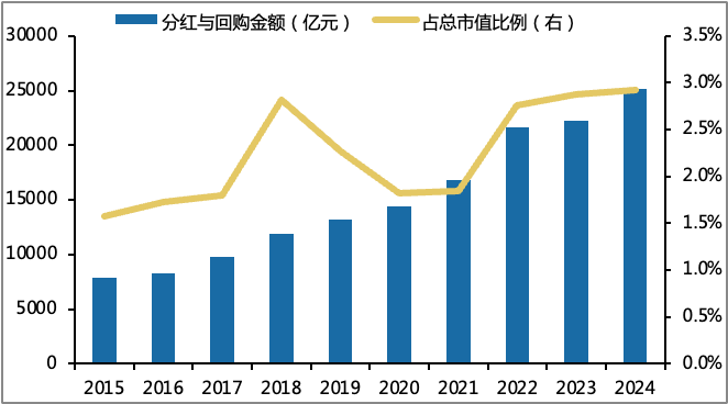 当然,我们也看到尽管过去两年权益市场表现不错,但居民资产进入权益市场的规模还不显著。我们理解的是,宏观经济体感不好,权益市场波动大,长期体验不好等等。这都是居民资产进入权益市场的阻碍。不过,事情也在发生变化,在监管层的努力下,市场波动率开始下降,上市公司分红回购规模持续增加,权益市场盈利模式在单一的交易模式之外,持有价值显著增加,这是A股市场走长期慢牛的基石。