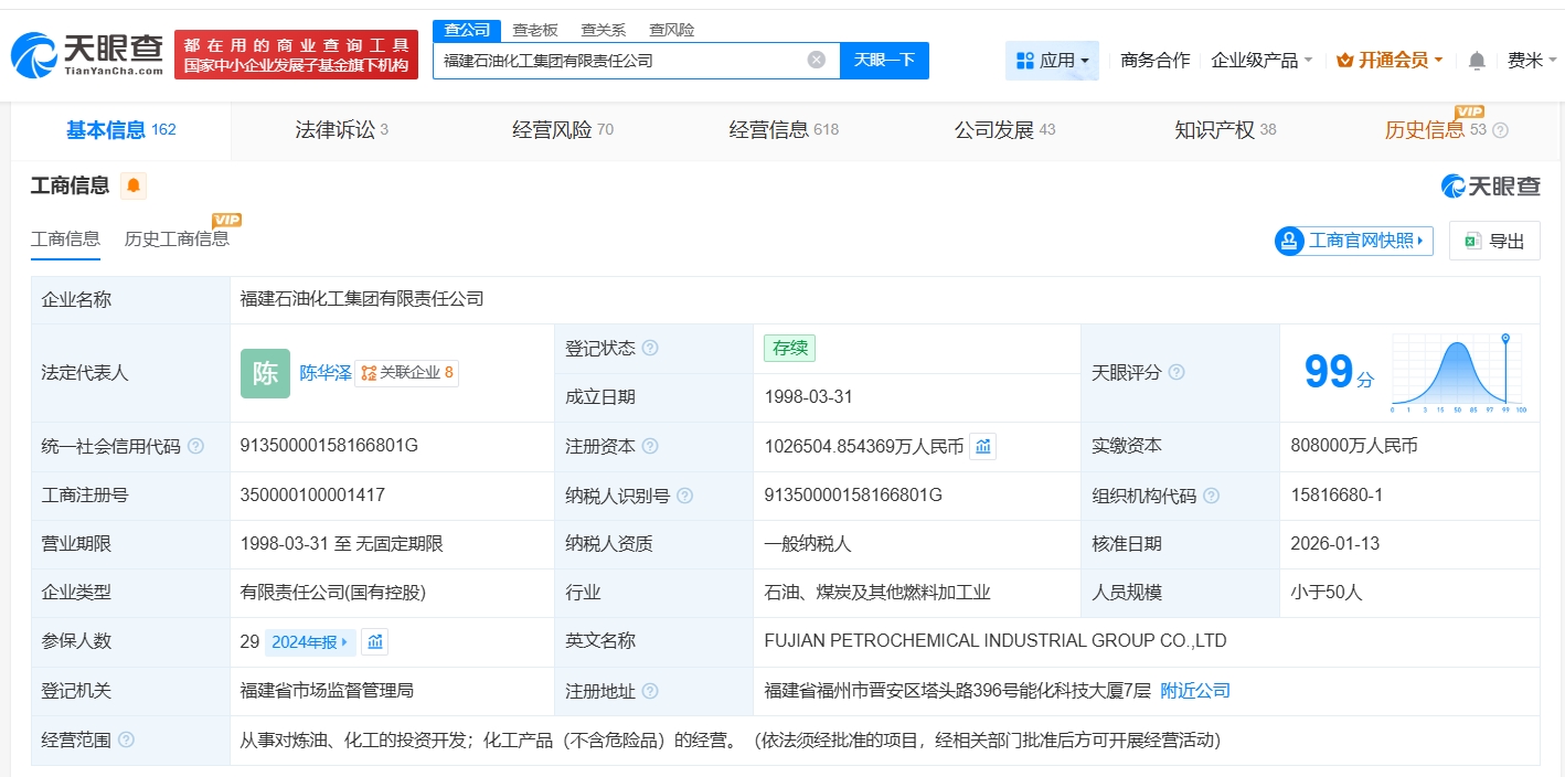 21财经1月15日电,天眼查工商信息显示,近日,福建石油化工集团有限责任公司发生工商变更,注册资本由91亿人民币增至约102.65亿人民币,增幅约13%,同时部分主要人员发生变更。福建石油化工集团有限责任公司成立于1998年3月,法定代表人为陈华泽,经营范围为从事对炼油、化工的投资开发,化工产品的经营。股东信息显示,该公司由福建省能源石化集团有限责任公司、福建省能化石化产业股权投资合伙企业(有限合伙)共同持股。