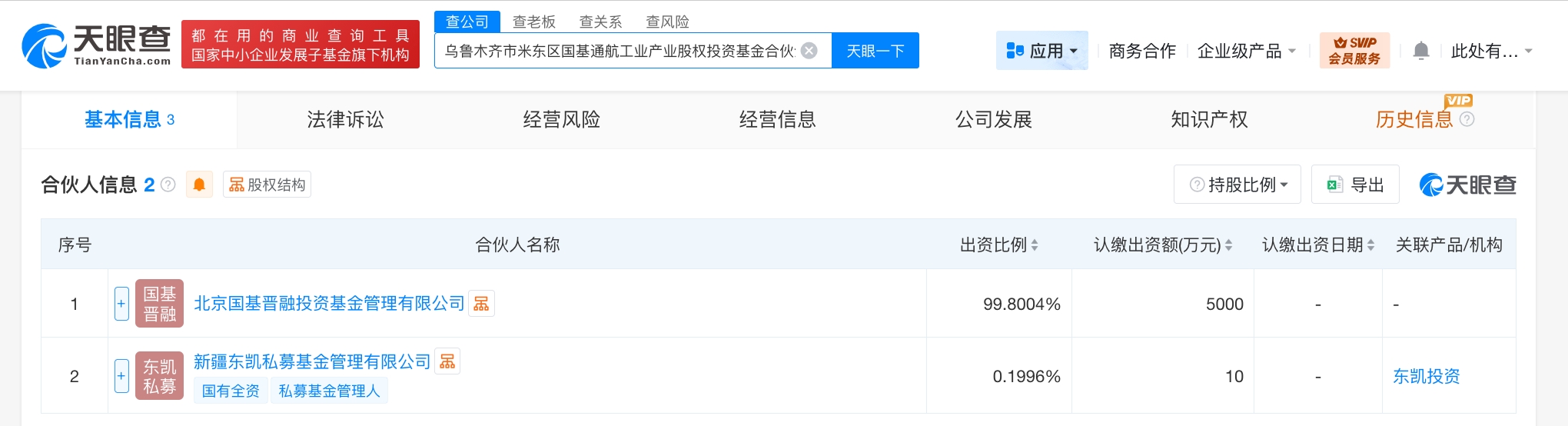 每经AI快讯,天眼查工商信息显示,近日,乌鲁木齐市米东区国基通航工业产业股权投资基金合伙企业(有限合伙)成立,执行事务合伙人为新疆东凯私募基金管理有限公司,出资额5010万元人民币,经营范围为以私募基金从事股权投资、投资管理、资产管理等活动。合伙人信息显示,该基金由北京国基晋融投资基金管理有限公司、新疆东凯私募基金管理有限公司共同出资。
