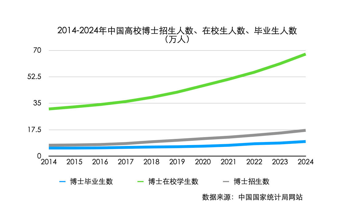 2014-2024年中国高校博士招生人数、在校生人数、毕业生人数(万人)趋势图。(图表制作:界面新闻/蔡星卓)