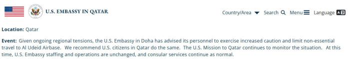 美国驻卡塔尔大使馆建议,在卡塔尔的美国公民保持警惕,关注当地及国际媒体的报道,审慎评估出行计划,密切留意卡塔尔政府及美国使馆发布的官方信息。