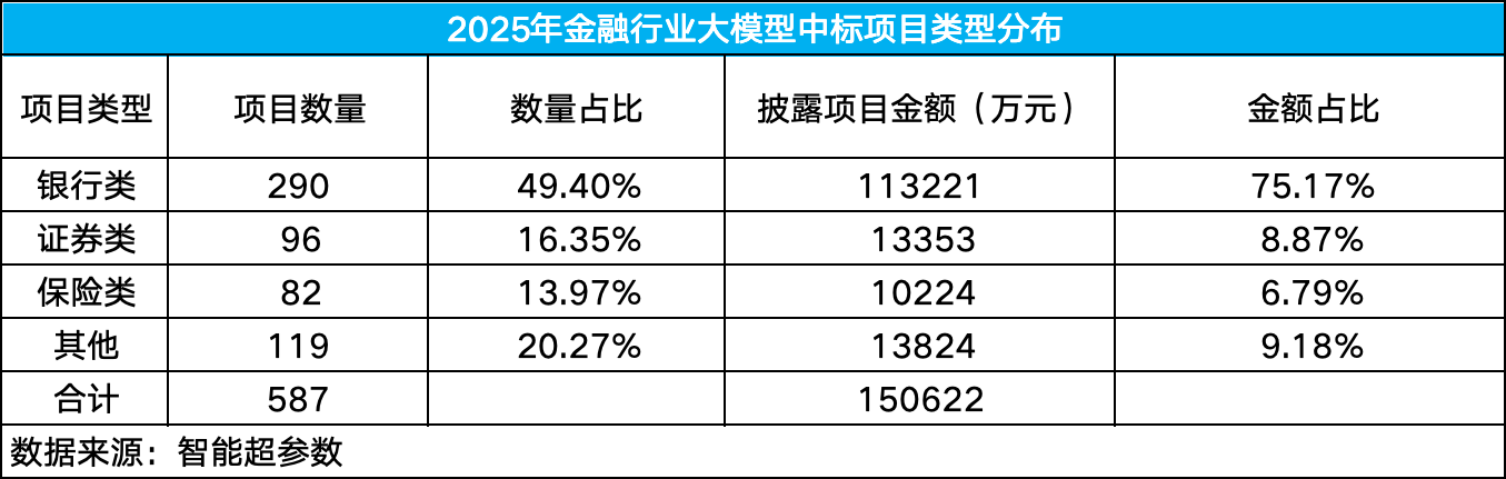 据长期关注大模型市场中标情况的“智能超参数”数据,2025年金融行业大模型中标项目达587个,披露金额15.06亿元,较2024年的133个项目、2.4亿元实现跨越式增长。
