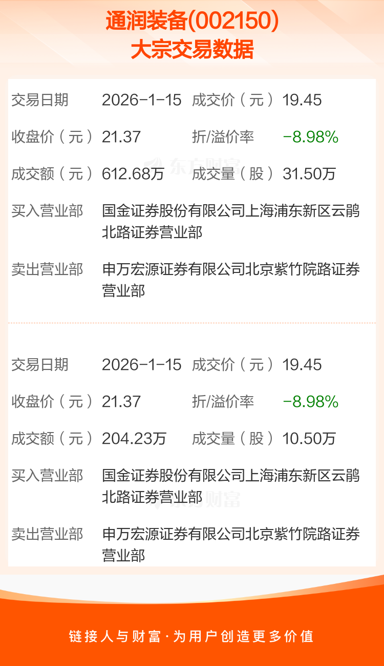 2026年1月15日,通润装备发生2笔大宗交易,共成交42.00万股,成交金额816.91万元,占其流通市值比例为0.11%。