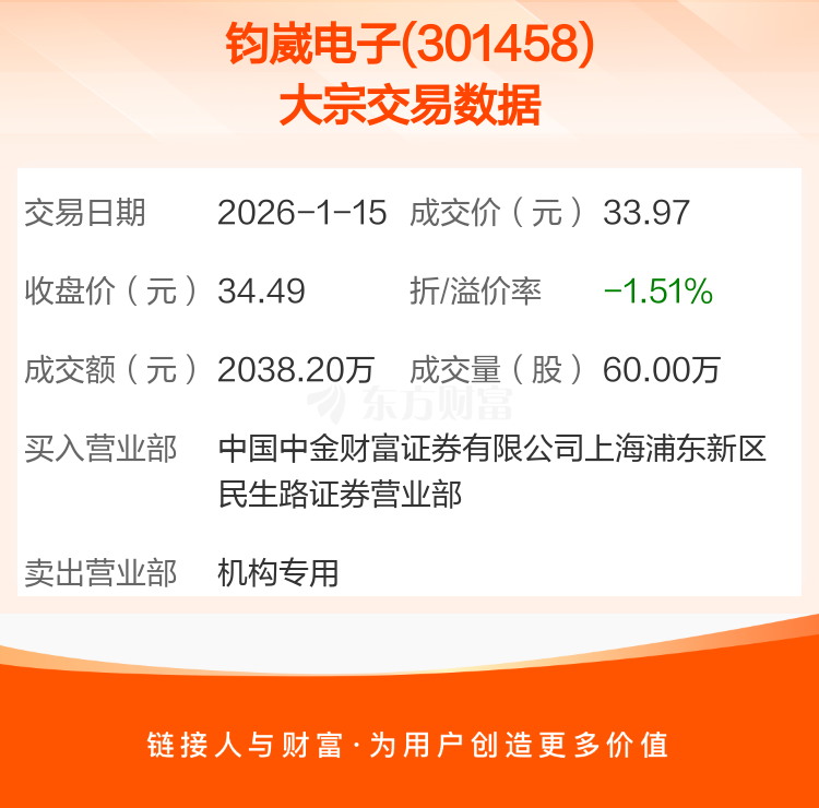 2026年1月15日,钧崴电子发生1笔大宗交易,共成交60.00万股,成交金额2038.20万元,占其流通市值比例为0.50%。
