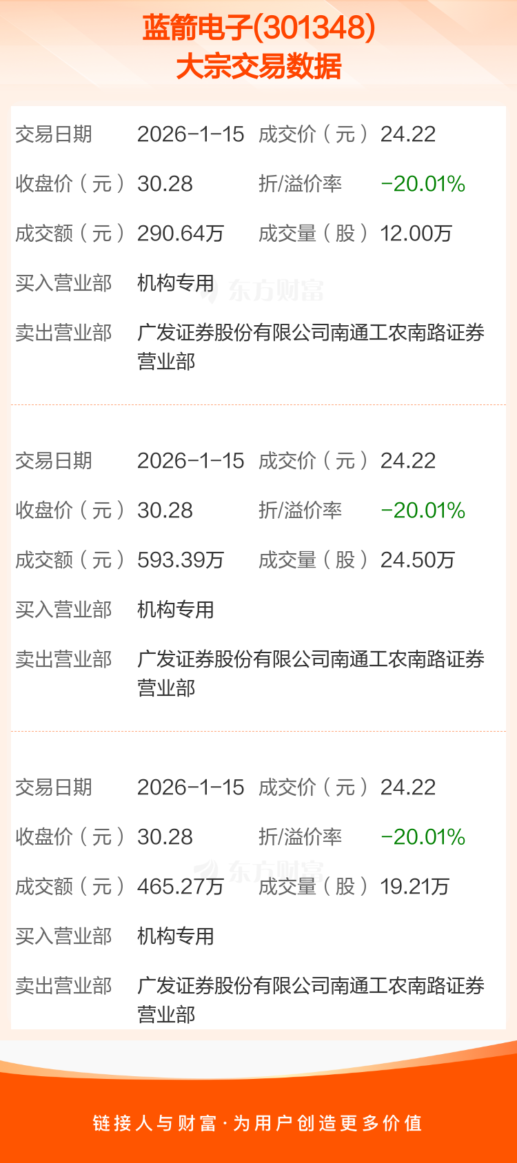 大宗交易:蓝箭电子成交1349.30万元,折价20.01%(1-15)