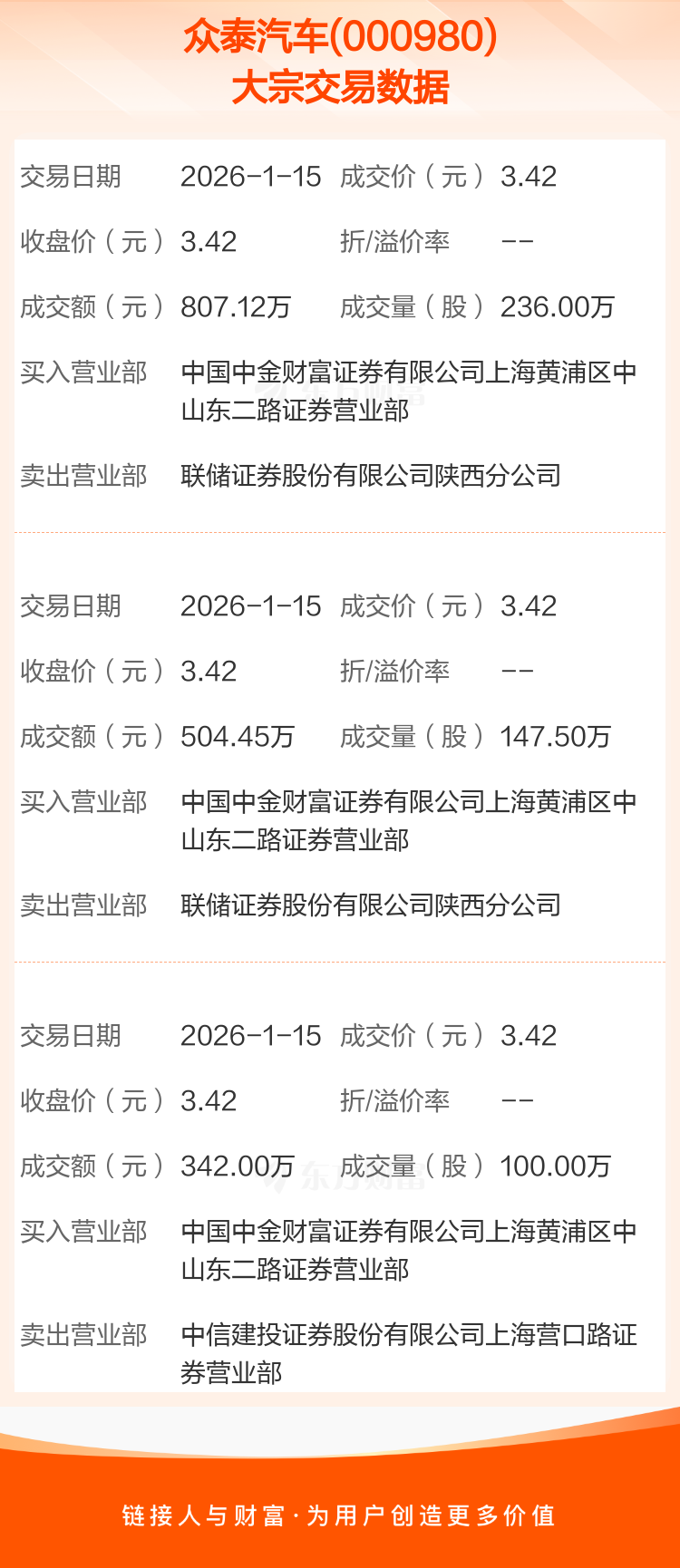 大宗交易:众泰汽车成交1653.57万元(1-15)