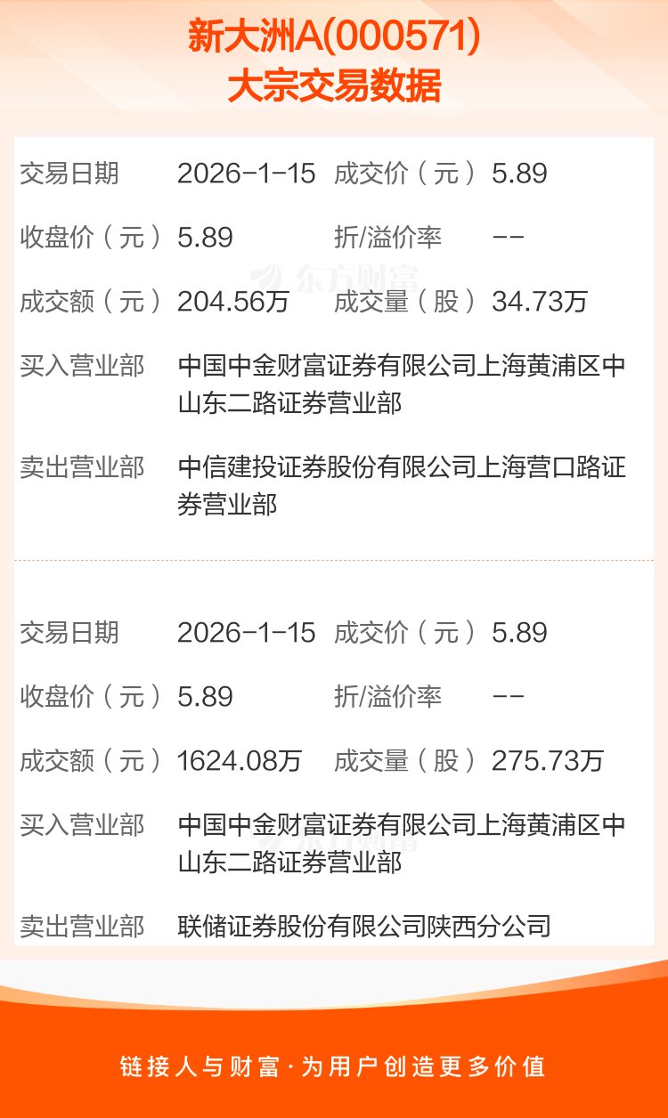 2026年1月15日,新大洲A发生2笔大宗交易,共成交310.46万股,成交金额1828.64万元,占其流通市值比例为0.38%。