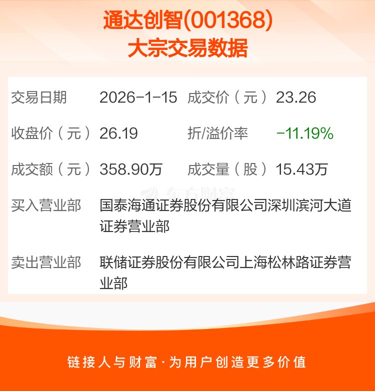 2026年1月15日,通达创智发生1笔大宗交易,共成交15.43万股,成交金额358.90万元,占其流通市值比例为0.43%。