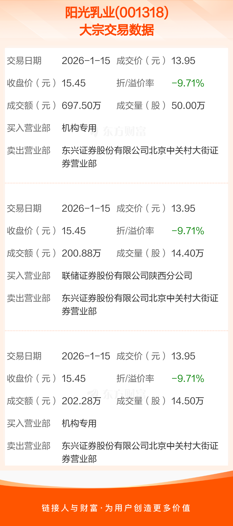 2026年1月15日,阳光乳业发生3笔大宗交易,共成交78.90万股,成交金额1100.66万元,占其流通市值比例为0.25%。