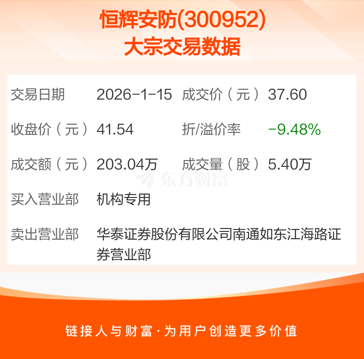 2026年1月15日,恒辉安防发生1笔大宗交易,共成交5.40万股,成交金额203.04万元,占其流通市值比例为0.05%。