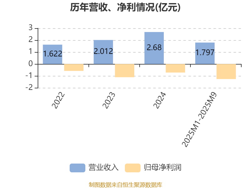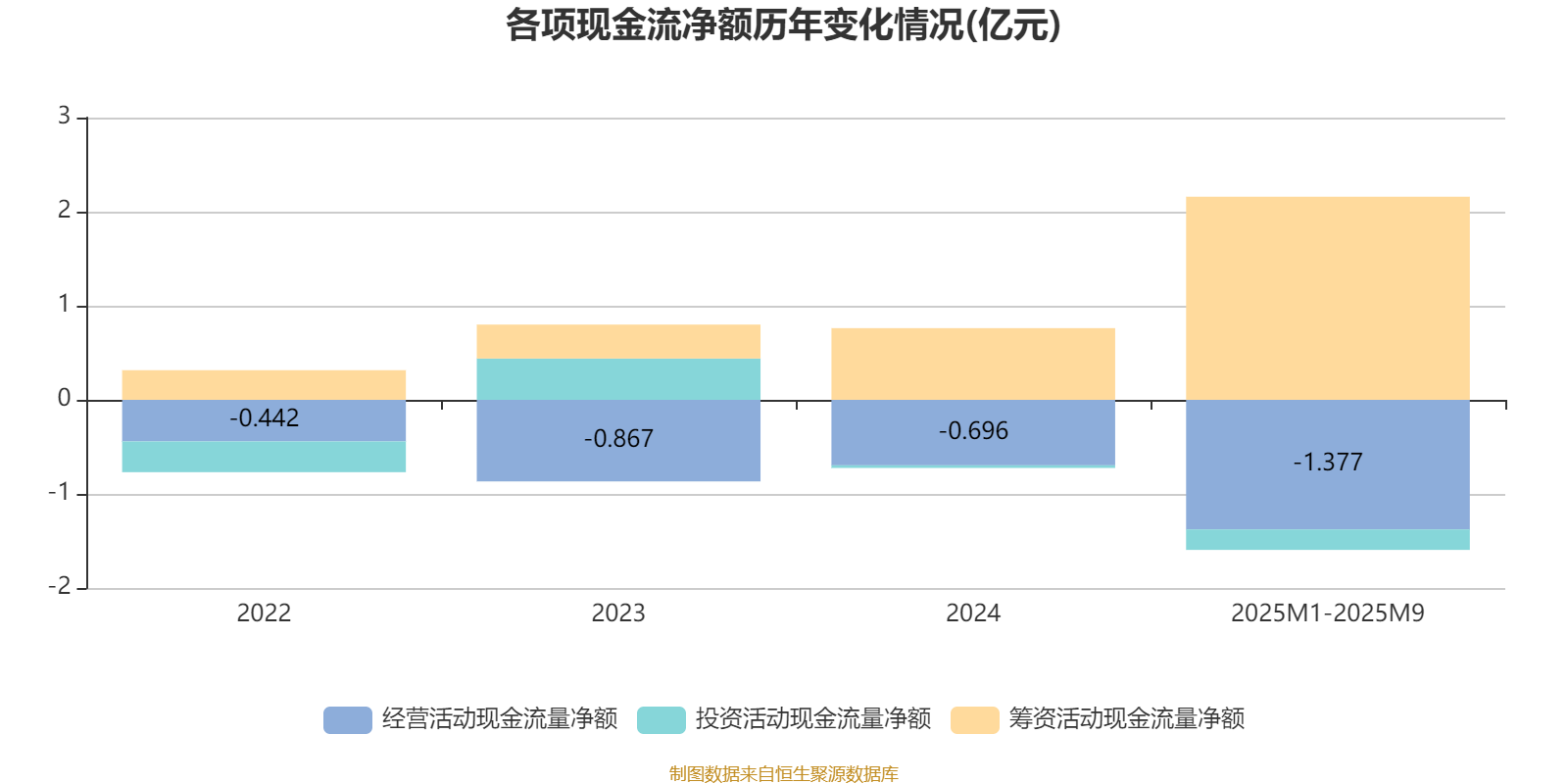 2025年1月至9月,公司经营活动现金流净额为-1.38亿元,同比减少7513.5万元;筹资活动现金流净额2.16亿元,同比增加1.7亿元;投资活动现金流净额-2177.6万元,上年同期为354.8万元。