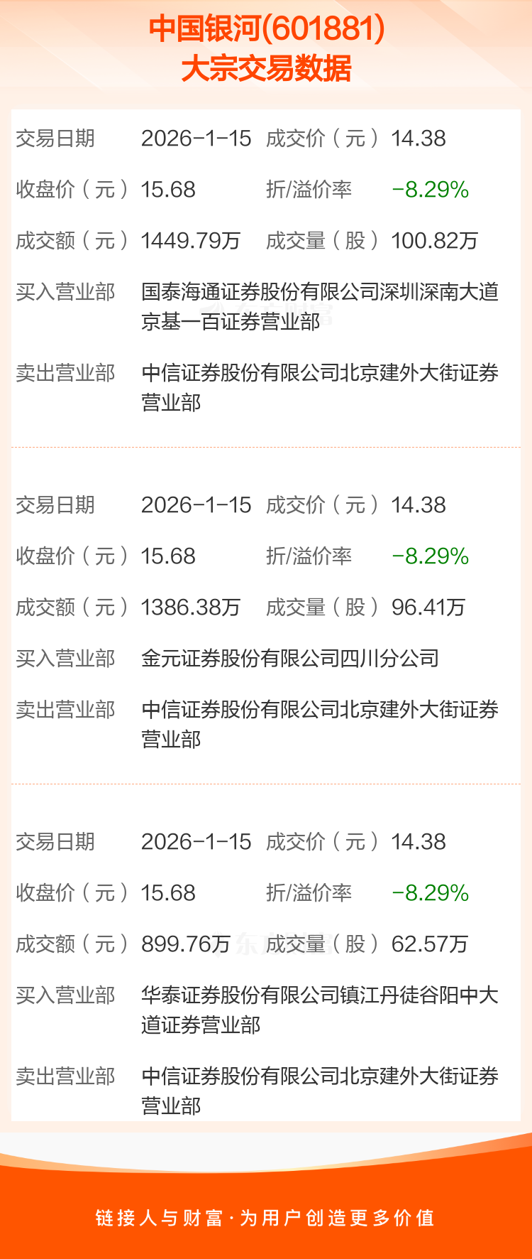 2026年1月15日,中国银河发生3笔大宗交易,共成交259.80万股,成交金额3735.93万元,占其流通市值比例为0.03%。