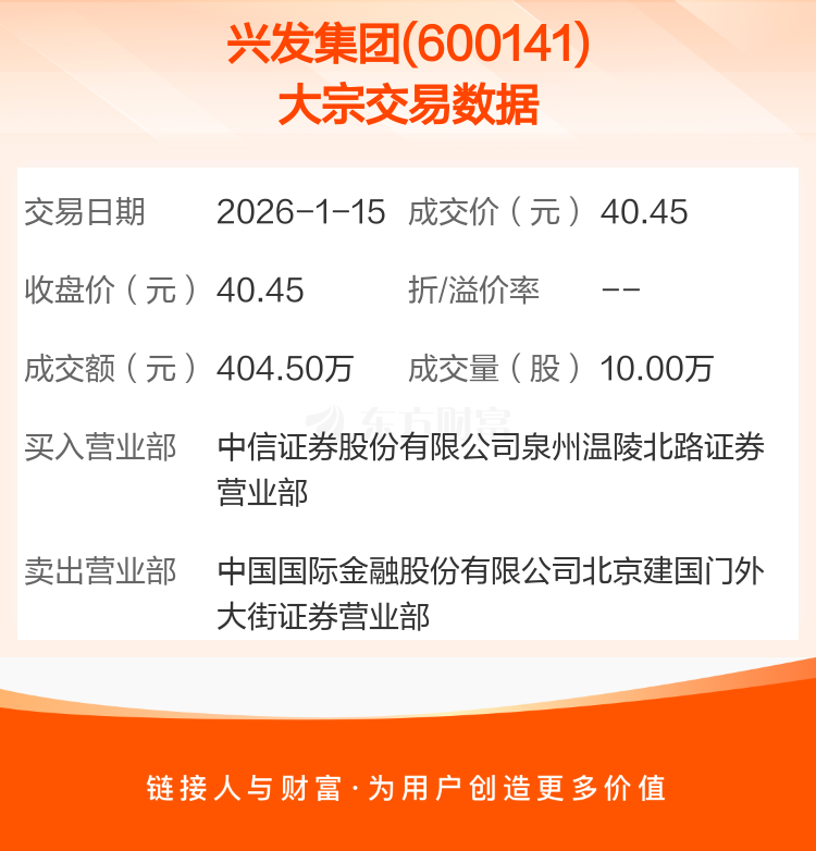 2026年1月15日,兴发集团发生1笔大宗交易,共成交10.00万股,成交金额404.50万元。