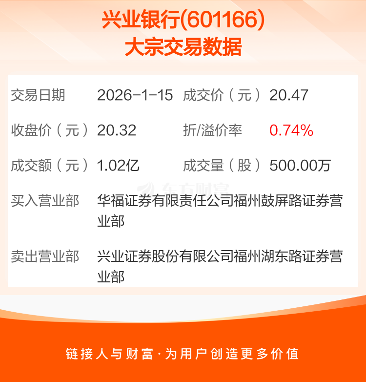 2026年1月15日,兴业银行发生1笔大宗交易,共成交500.00万股,成交金额1.02亿元,占其流通市值比例为0.02%。