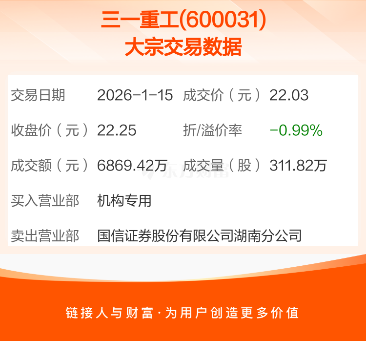 大宗交易:三一重工成交6869.42万元,折价0.99%(1-15)