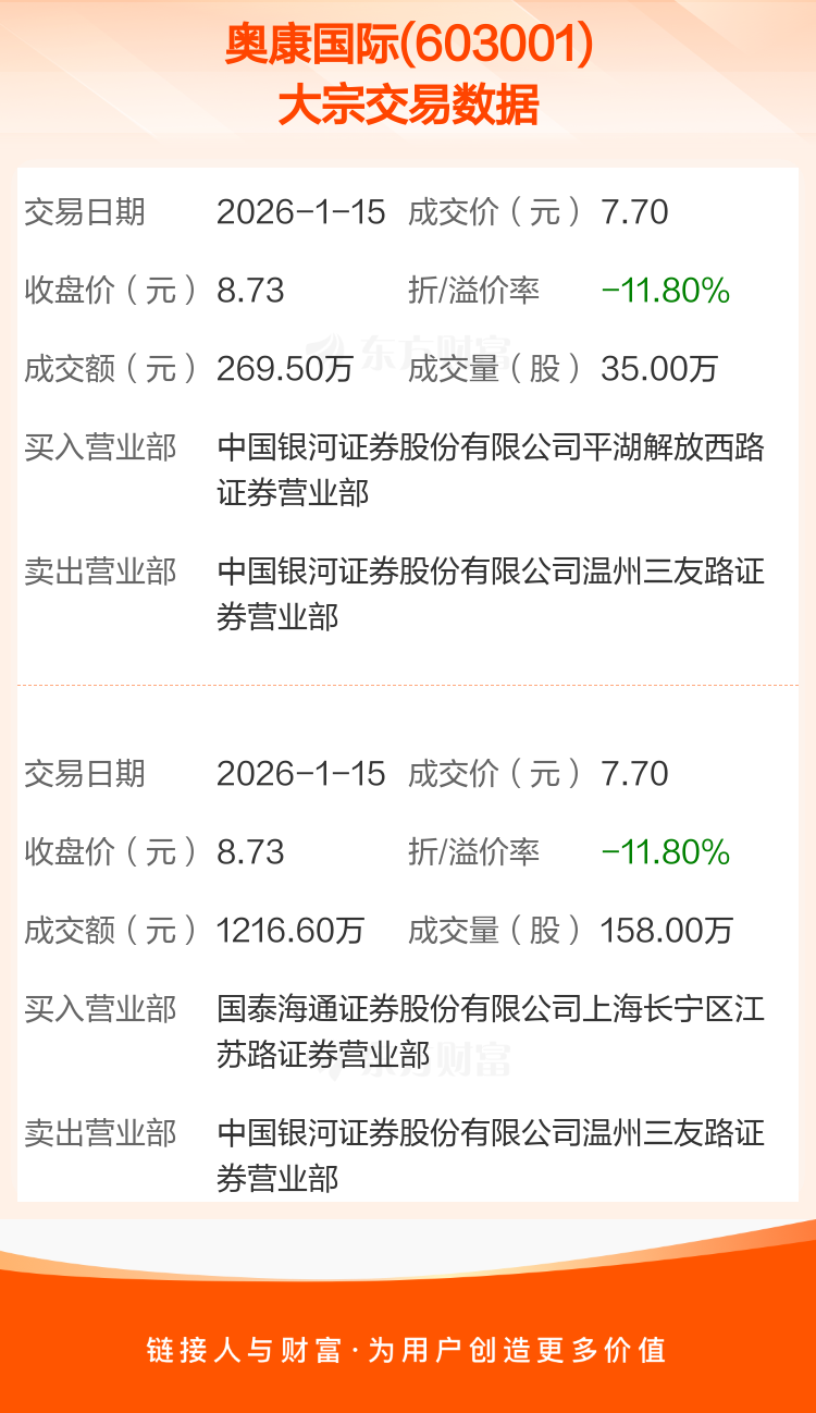 2026年1月15日,奥康国际发生2笔大宗交易,共成交193.00万股,成交金额1486.10万元,占其流通市值比例为0.42%。
