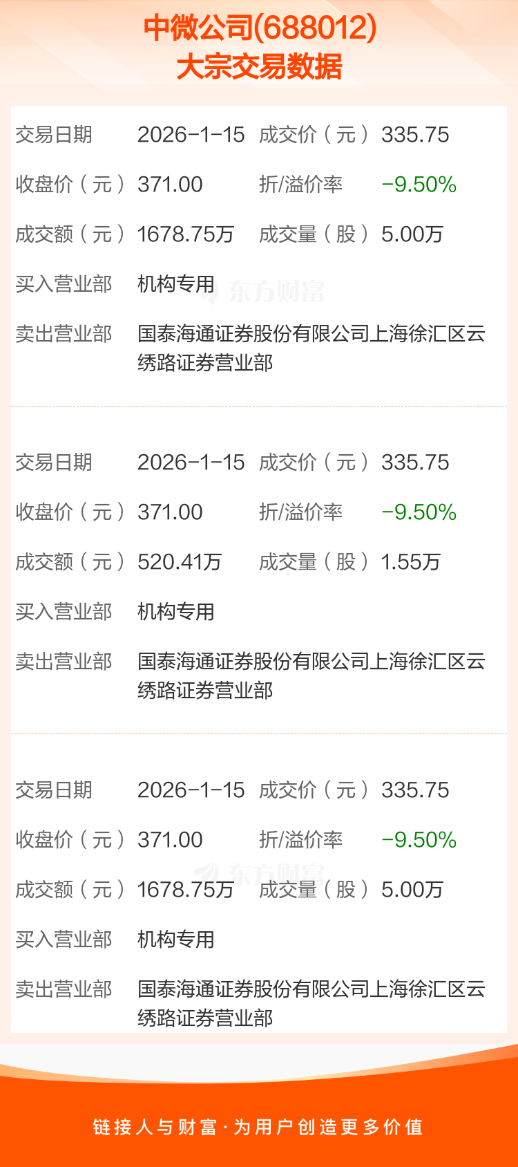 2026年1月15日,中微公司发生3笔大宗交易,共成交11.55万股,成交金额3877.91万元,占其流通市值比例为0.02%。