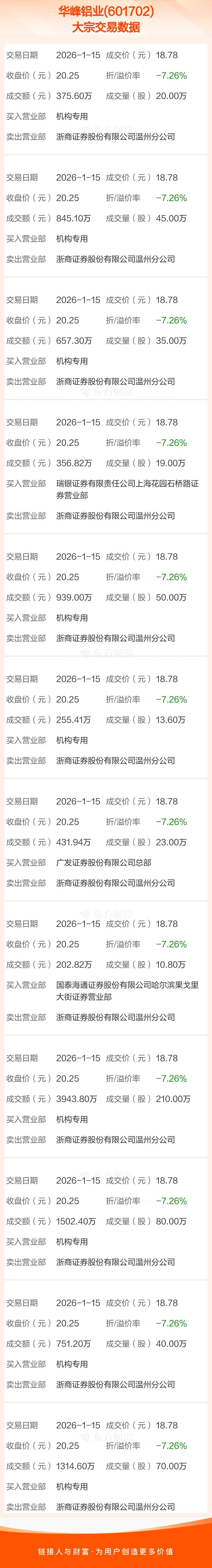大宗交易:华峰铝业成交1.16亿元,折价7.26%(1-15)