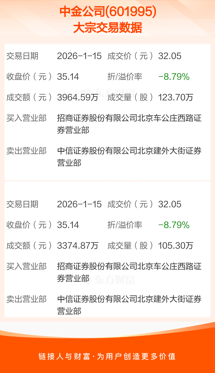 2026年1月15日,中金公司发生2笔大宗交易,共成交229.00万股,成交金额7339.46万元,占其流通市值比例为0.07%。