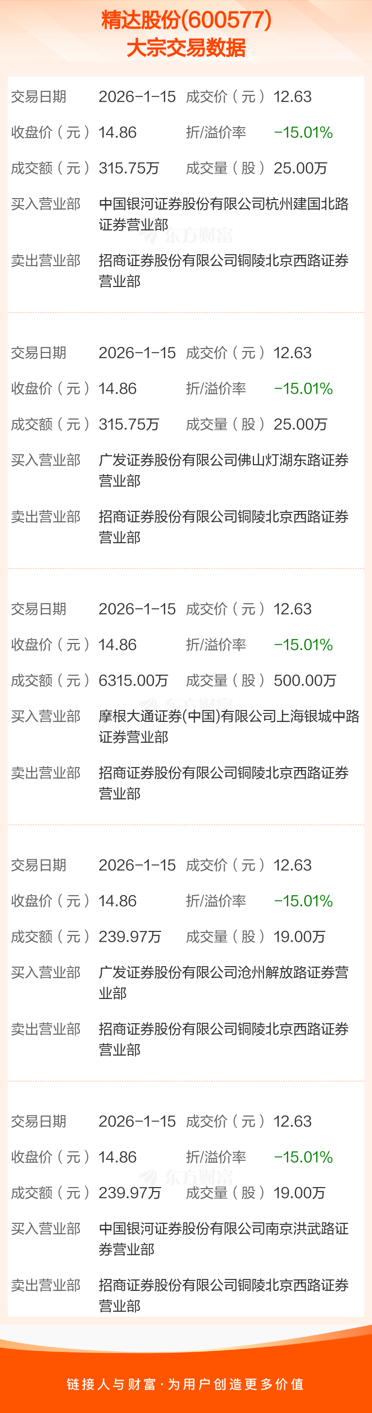 5笔大宗交易成交均价12.63元,较该股当日收盘价14.86元折价15.01%。