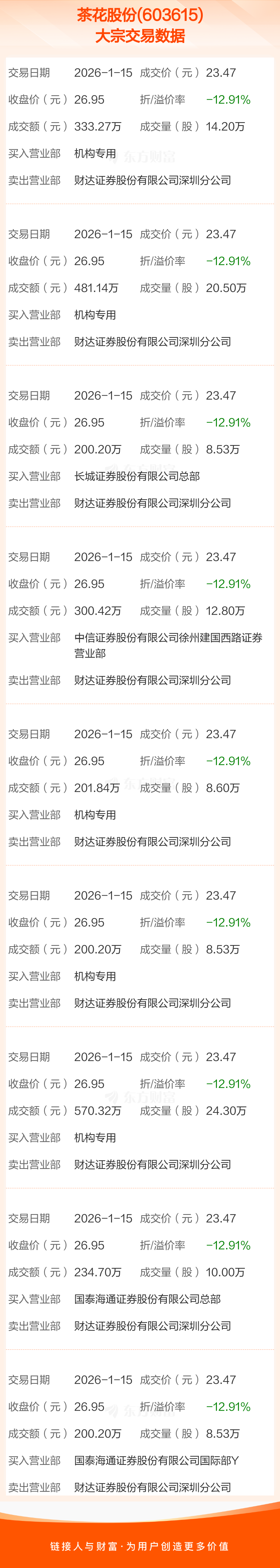 大宗交易:茶花股份成交2722.29万元,折价12.91%(1-15)