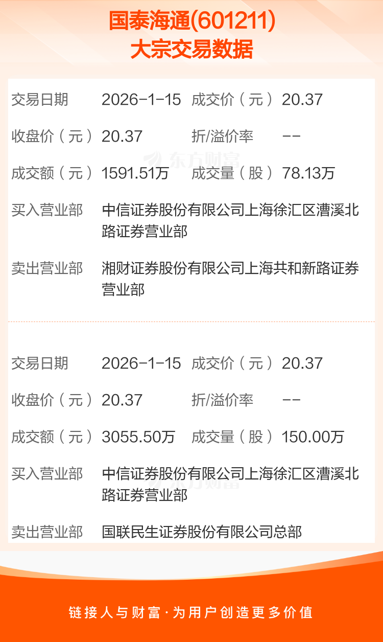 2026年1月15日,国泰海通发生2笔大宗交易,共成交228.13万股,成交金额4647.01万元,占其流通市值比例为0.02%。