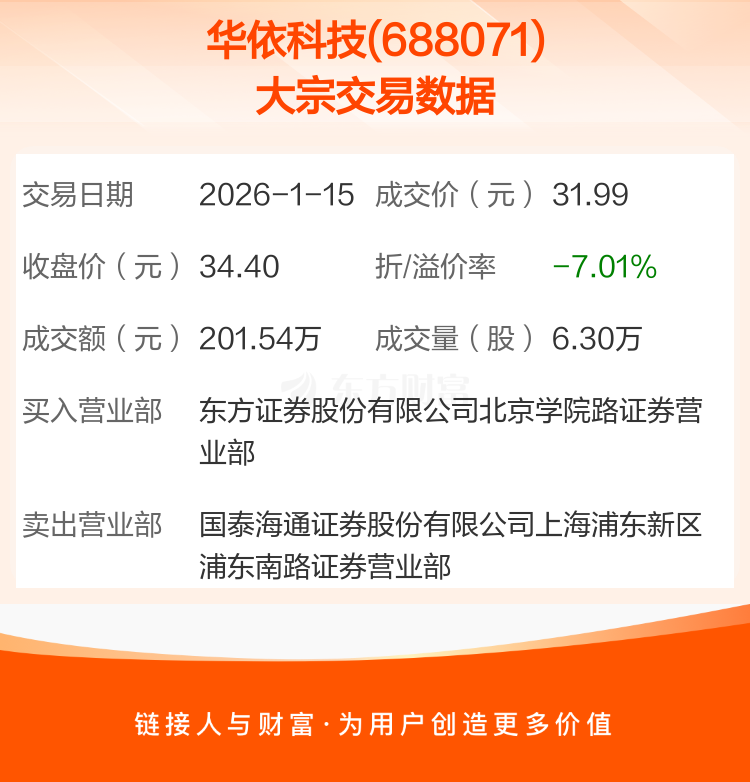 2026年1月15日,华依科技发生1笔大宗交易,共成交6.30万股,成交金额201.54万元,占其流通市值比例为0.07%。