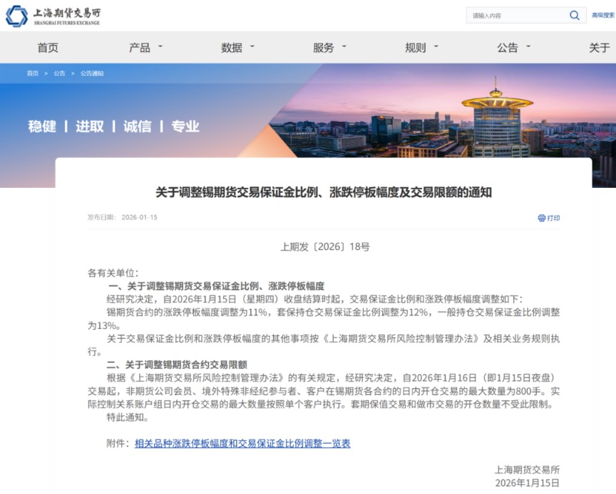 1月15日,上期所发布《关于调整锡期货交易保证金比例、涨跌停板幅度及交易限额的通知》(以下简称《通知》)。