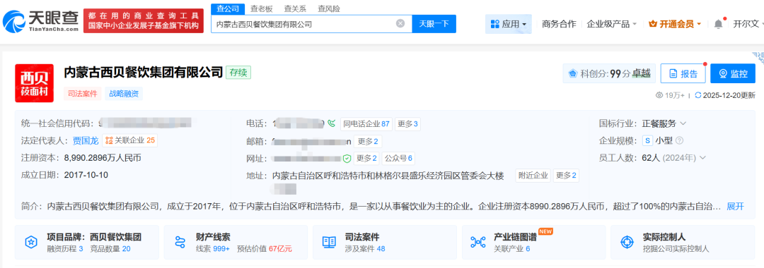 天眼查信息显示,西贝关联公司内蒙古西贝餐饮集团有限公司成立于2017年10月,法定代表人为贾国龙,注册资本约8990万元。对外投资信息显示,该公司直接持股189家企业,其中,150余家企业为存续状态,30余家企业已注销。