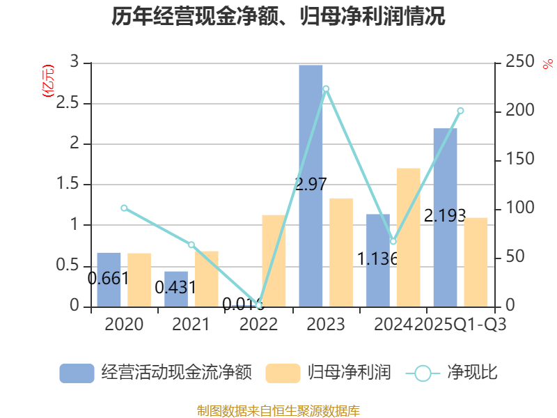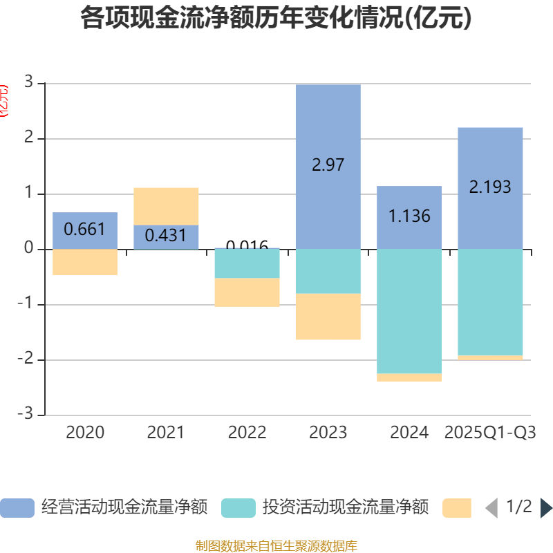 2025年前三季度,公司经营活动现金流净额为2.19亿元,同比增长204.54%;筹资活动现金流净额-811.66万元,同比增加5.27万元;投资活动现金流净额-1.93亿元,上年同期为-1.95亿元。