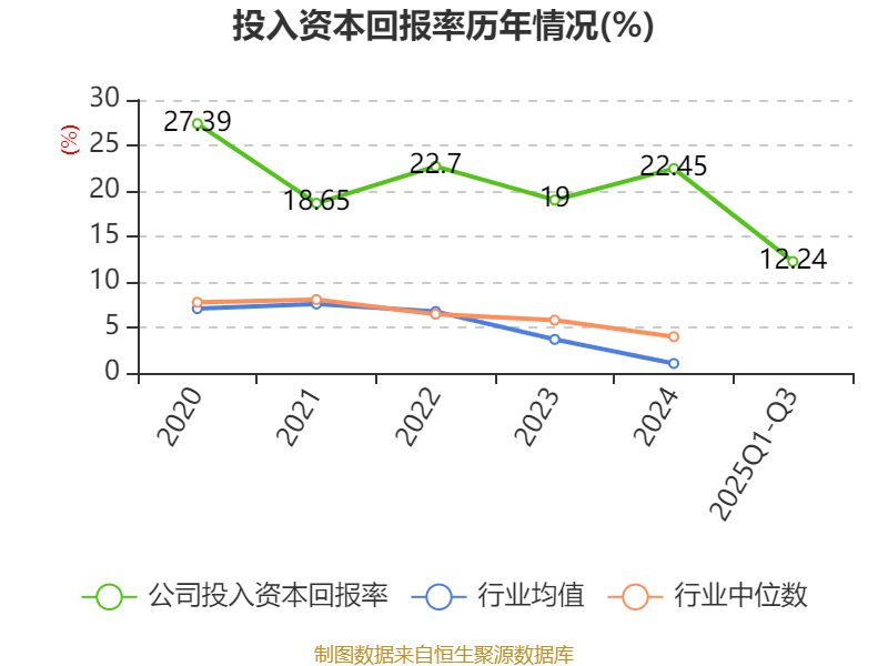 公司2024年投入资本回报率为22.45%,较上年同期上升3.45个百分点。2025年前三季度投入资本回报率为12.24%,较上年同期下降23.4个百分点。
