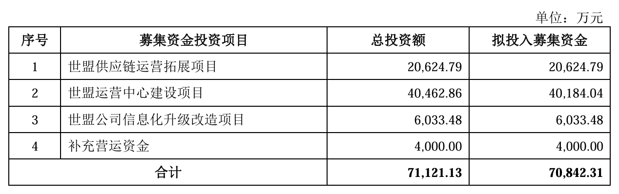 世盟运营中心建设项目计划投入4.05亿元,拟于上海市浦东新区、北京市通州区和内蒙古自治区呼和浩特市分别建设世盟长三角运营中心、世盟华北运营中心和世盟内蒙古运营中心,作为区域运营中心辐射长三角地区、华北和内蒙古区域。建设内容主要包括仓储与办公场所建设、配套仓储设备与设施的购置、仓储与报关人员以及相应管理人员的招聘。 通过此项目投资,提升公司的仓储与配套物流服务能力,借助公司在技术、管理和客户服务等方面的优势,更好的为下游客户提供高效率的仓储物流服务,增强公司的竞争优势。