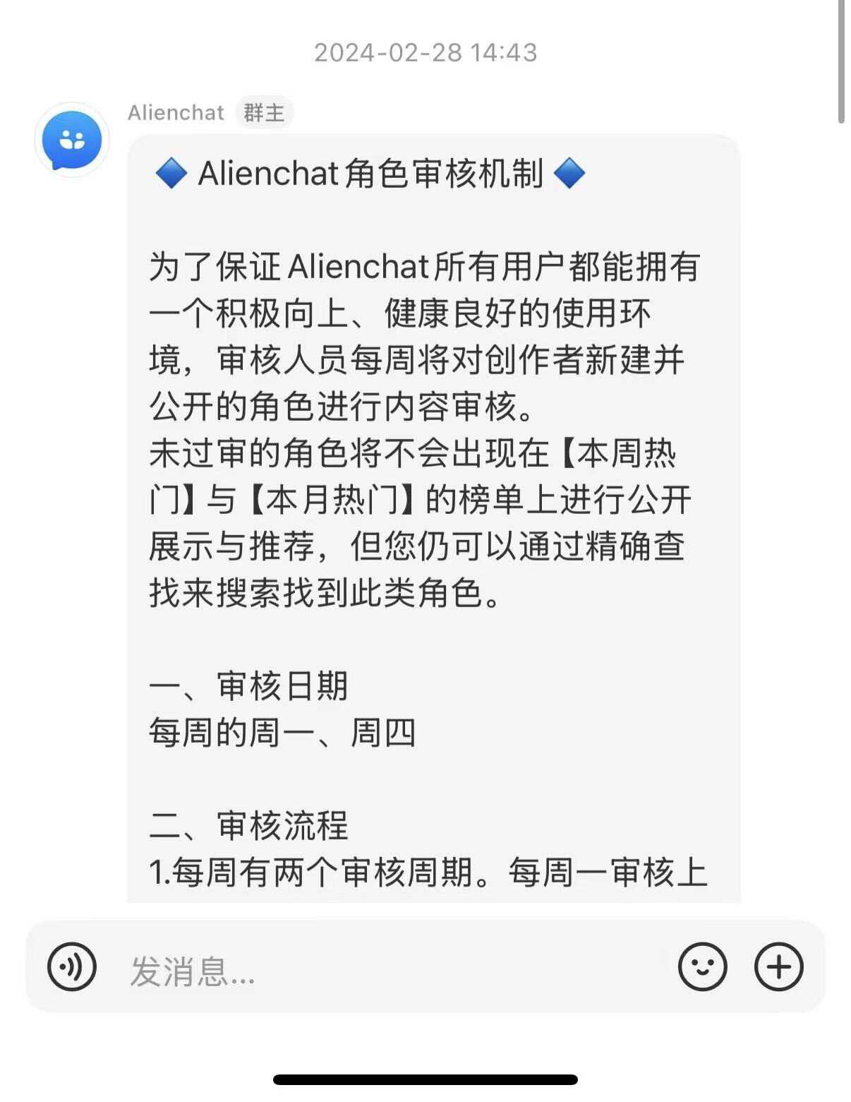 随着收费启动,AC开始加强内容安全。11月时,平台宣布会对公开角色实行人工审核;2024年2月,又进一步明确审核规则,要求角色简介、开场白和剧情分支名不得包含性器官描写和明显性暗示。