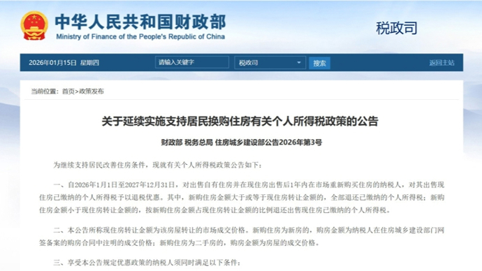 今天,财政部、税务总局、住房城乡建设部联合发布《关于延续实施支持居民换购住房有关个人所得税政策的公告》。自2026年1月1日至2027年12月31日,对出售自有住房并在现住房出售后1年内在市场重新购买住房的纳税人,对其出售现住房已缴纳的个人所得税予以退税优惠。