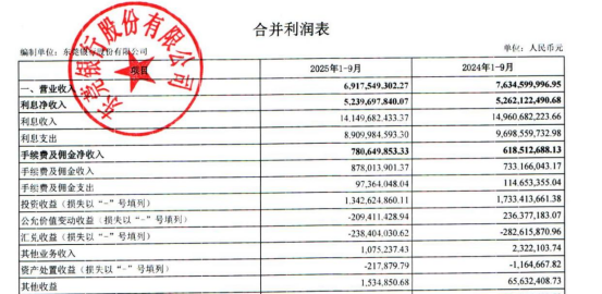 从其最新更新的IPO审核材料披露数据来看,该行正面临营收与净利润双双下滑的压力。2025年前三季度,东莞银行实现营业收入69.18亿元,同比下降9.39%;净利润为25.44亿元,同比降幅扩大至20.66%。