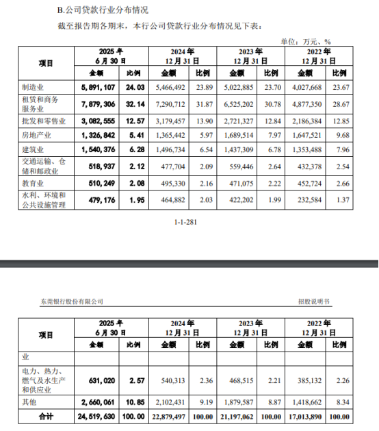 从招股书中,记者发现,东莞银行贷款集中度较高的业务结构问题较为突出。披露显示,截至2025年6月末,公司贷款和垫款总额占发放贷款和垫款总额的64.96%,其中前五大行业分别为租赁和商务服务业、制造业、批发零售业、建筑业和房地产业,占比分别为32.13%、24.03%、12.57%、6.28%和5.41%。