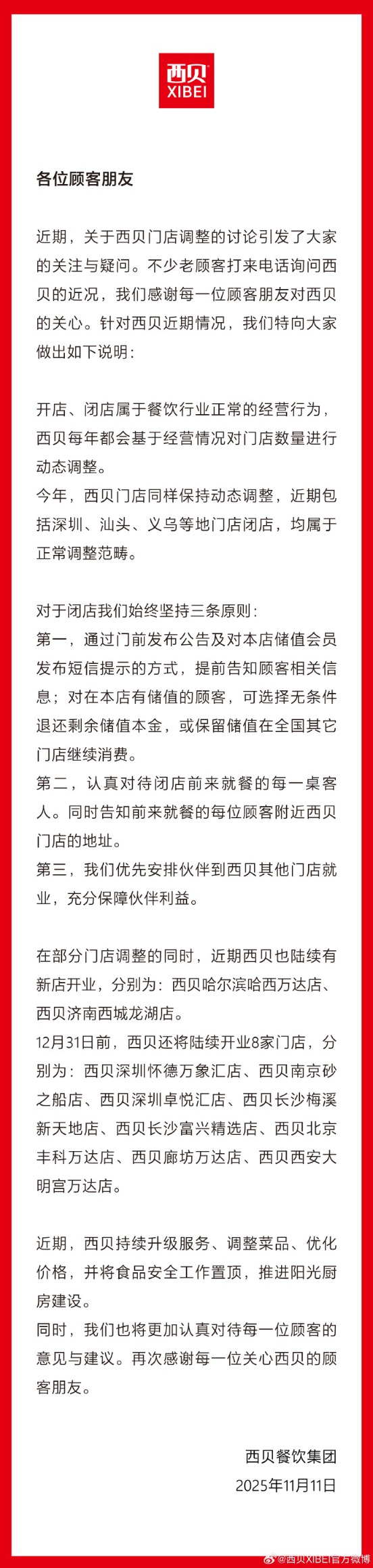 11月11日上午,针对网传的“闭店潮”,西贝官方发布声明称,开店、闭店属于餐饮行业正常的经营行为。近期包括深圳、汕头、义乌等地门店闭店,均属于正常调整范畴。