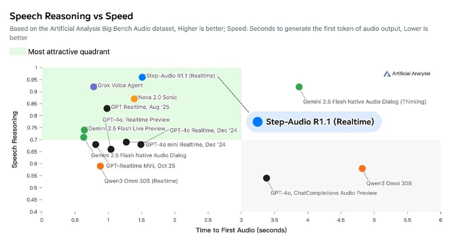 根据榜单评测,在性能与速度的综合权衡上,Step-Audio-R1.1 全面碾压同类语音模型。