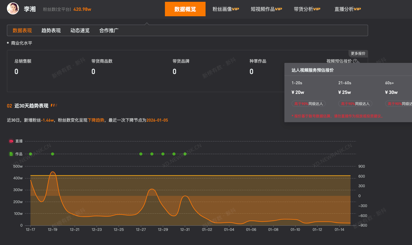 第三方数据显示,截至1月16日11时,李湘视频平台粉丝数为421万,近30日掉粉1.46万。商业化水平显示,其1-20s、21-60s、60s以上视频广告报价分别为20万元、25万元、30万元。