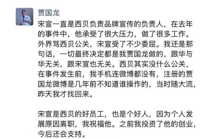 此外,西贝创始人贾国龙也在朋友圈中明确,宋宣因为个人发展原因离职,“宋宣一直是西贝负责品牌宣传的负责人,在去年的事件中,他承受了很大压力,做了很多工作。外界骂西贝公关,宋宣受了不少委屈。一切最终决定都是我贾国龙做的,跟华与华无关,跟宋宣也无关。西贝其实没什么公关,在事件发生前,我手机连微博都没有,注册的贾国龙微博是几年前不知道谁操作的,当时随大流,昨天我才找回来。宋宣是西贝的好员工,也是个好人,因为个人发展原因离职,我祝福他。之前我投资了他的创业,今后还会支持。”